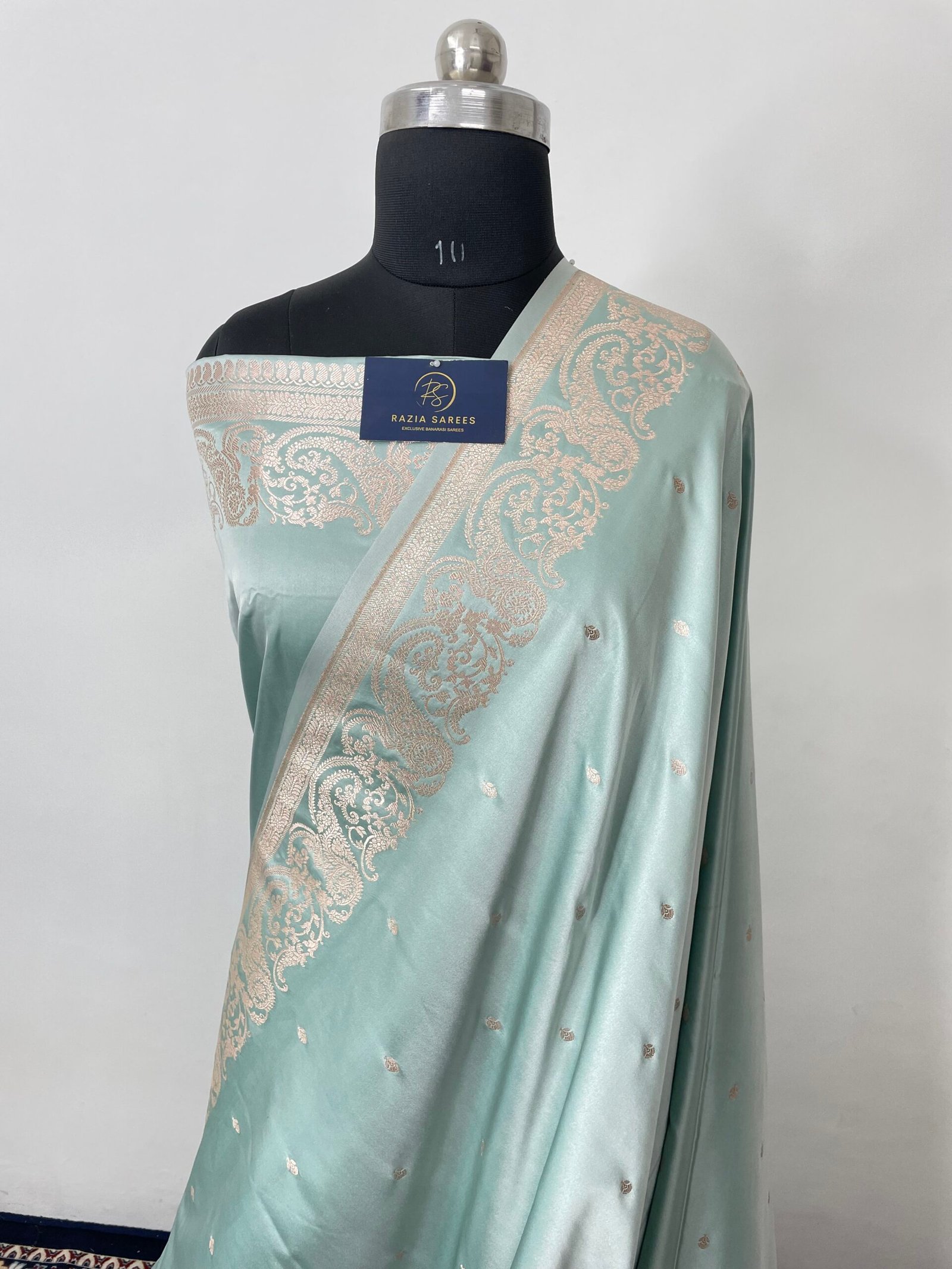 The Baby Blue Mashru Katan Silk Banarasi Saree showcases exquisite craftsmanship with rich banarasi zari on fine Katan silk. Its vibrant shade and elegant texture make it perfect for special occasions, combining traditional artistry with lasting quality and graceful drape.