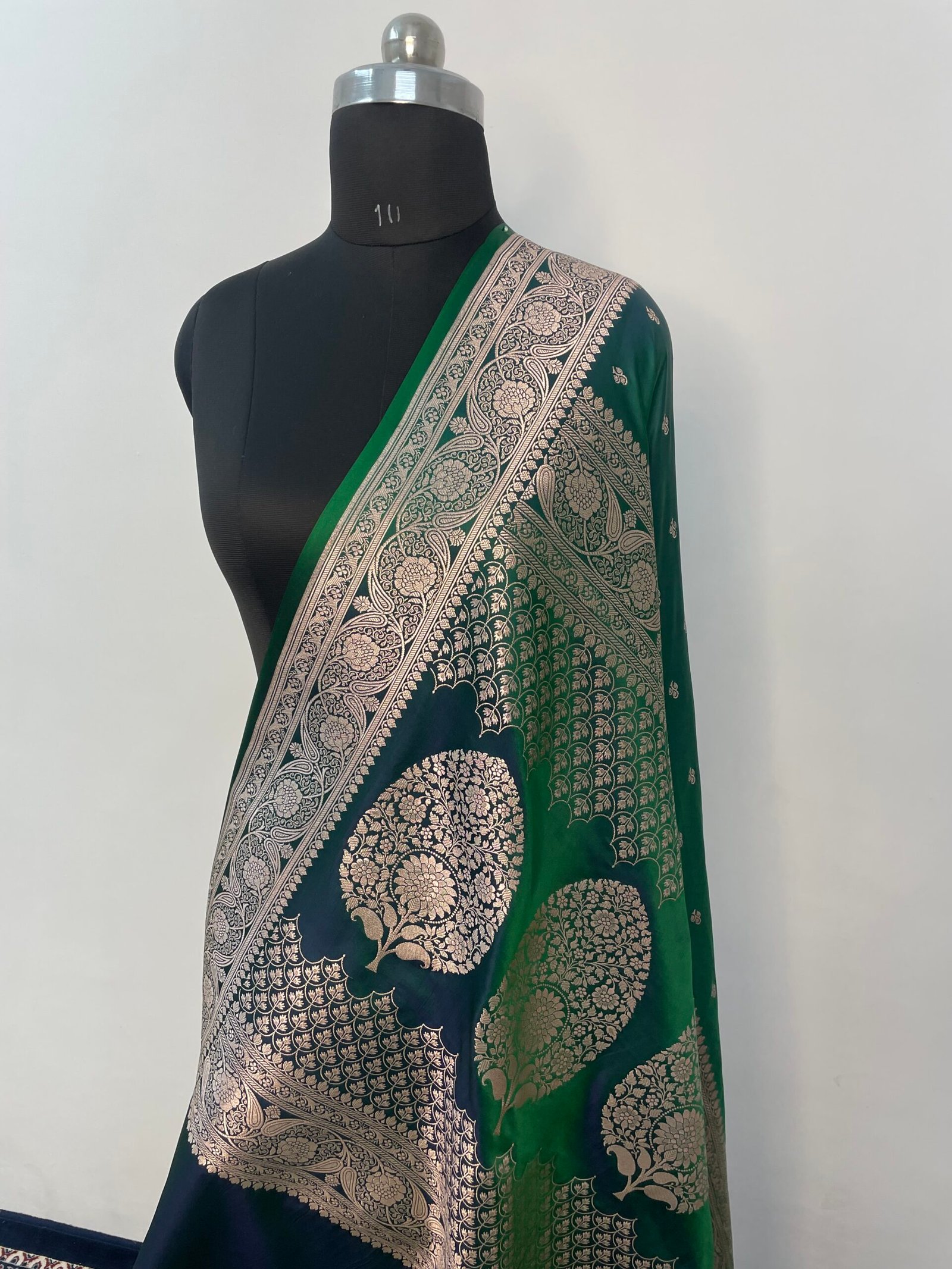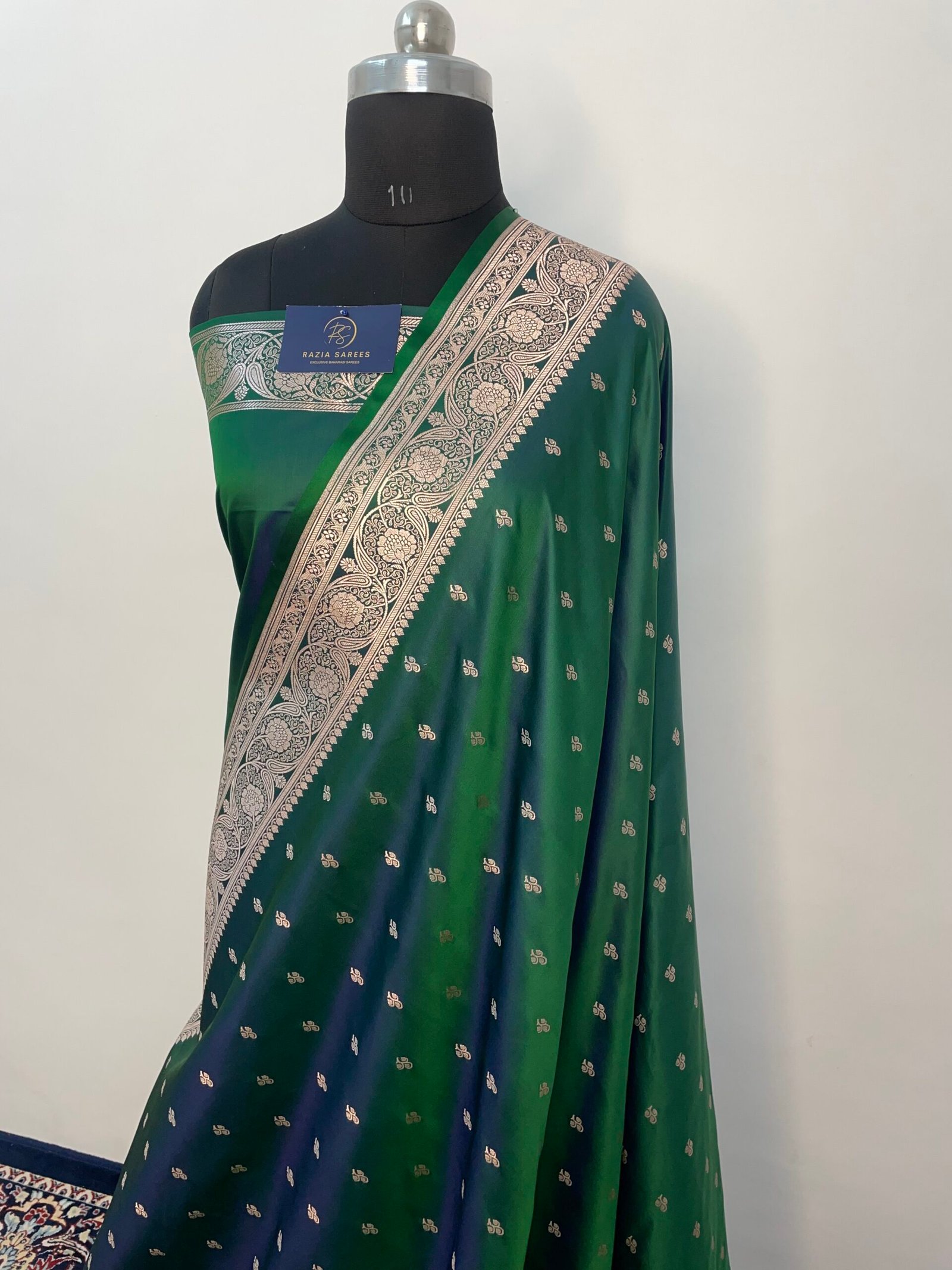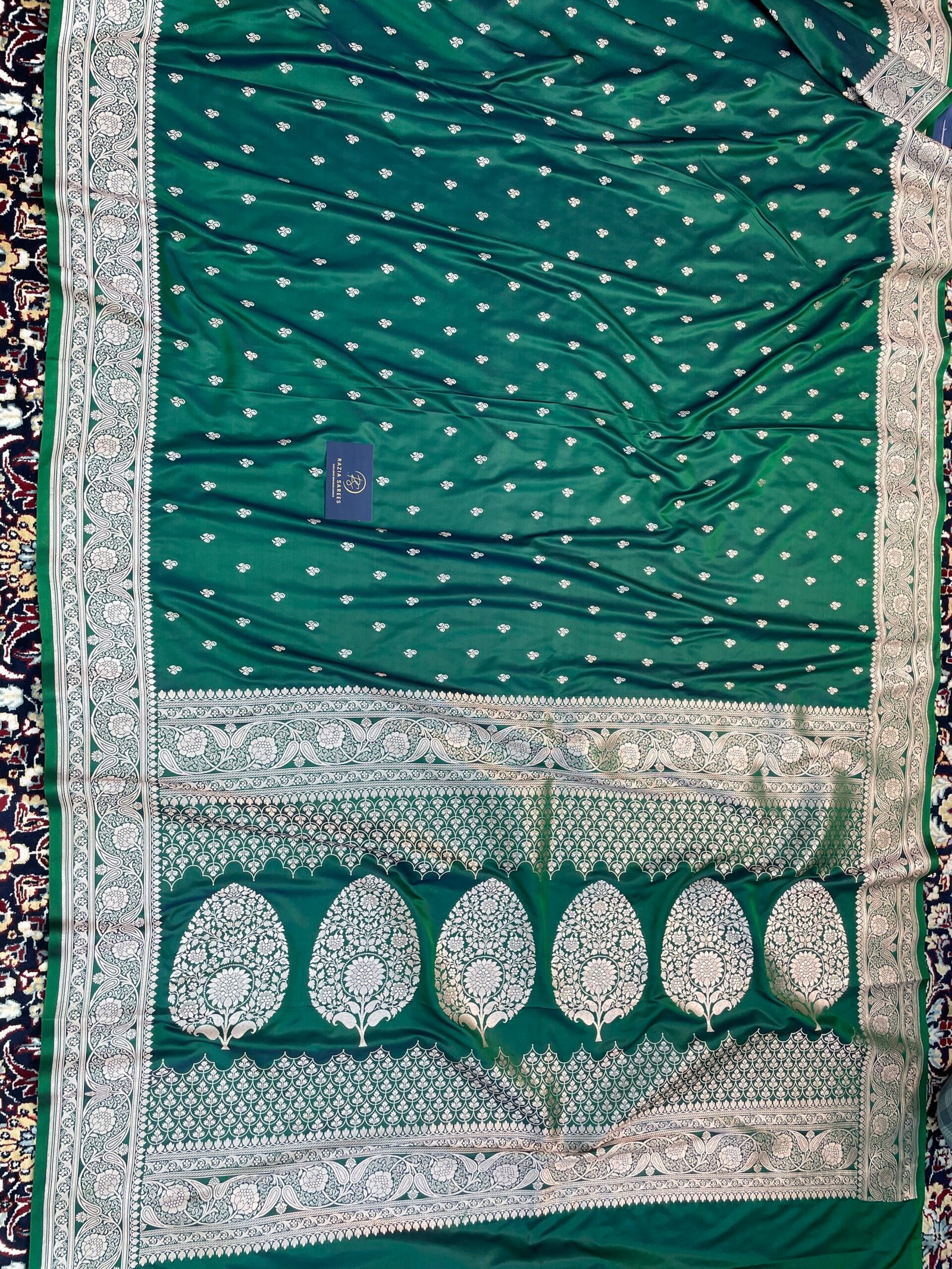 The Bottle Green Booti Mashru Katan Silk Banarasi Saree showcases exquisite craftsmanship with rich banarasi zari on fine Katan silk. Its vibrant shade and elegant texture make it perfect for special occasions, combining traditional artistry with lasting quality and graceful drape.
