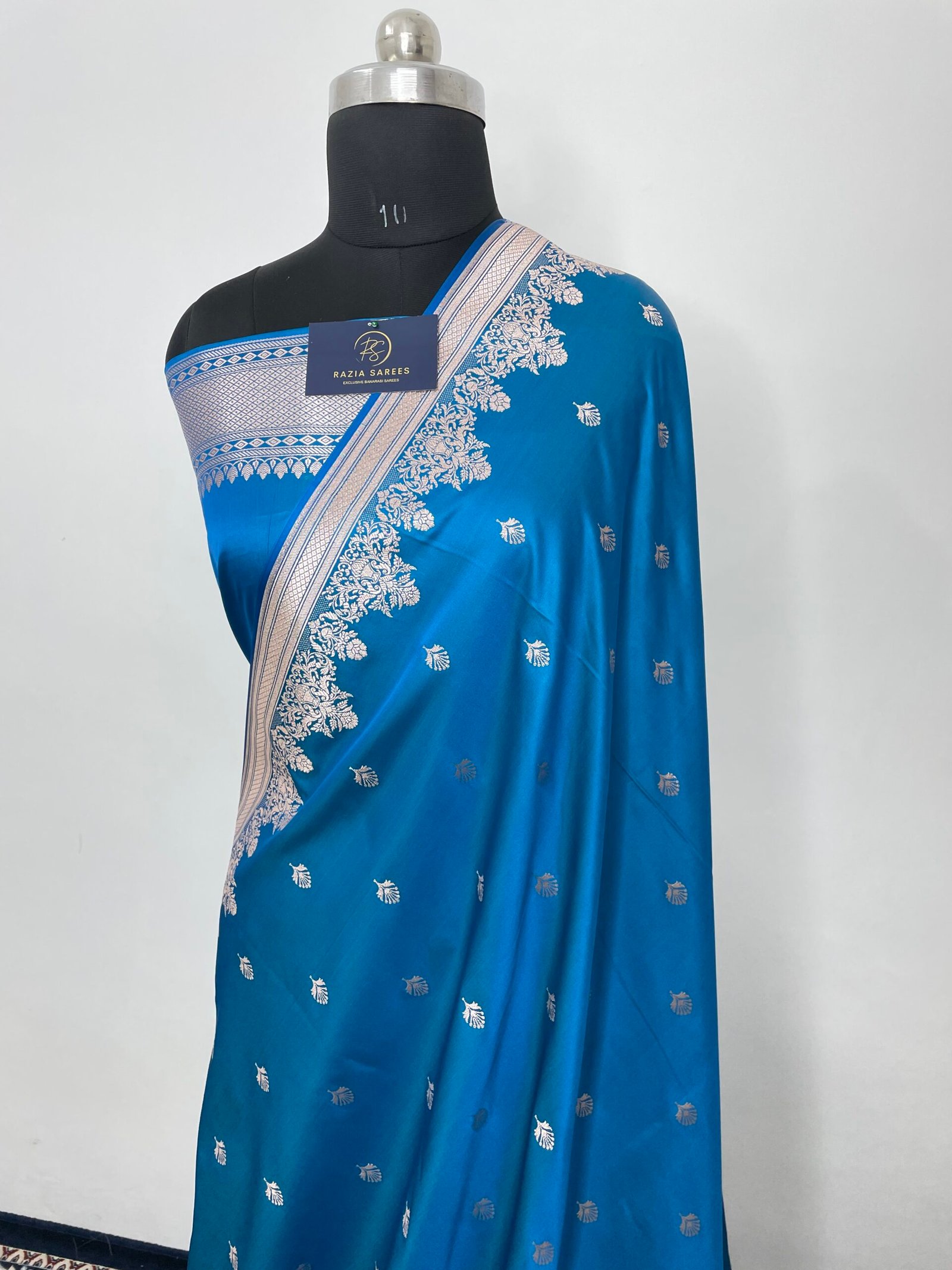 Ivory Firozy Designer Booti Mashru Katan Silk Saree