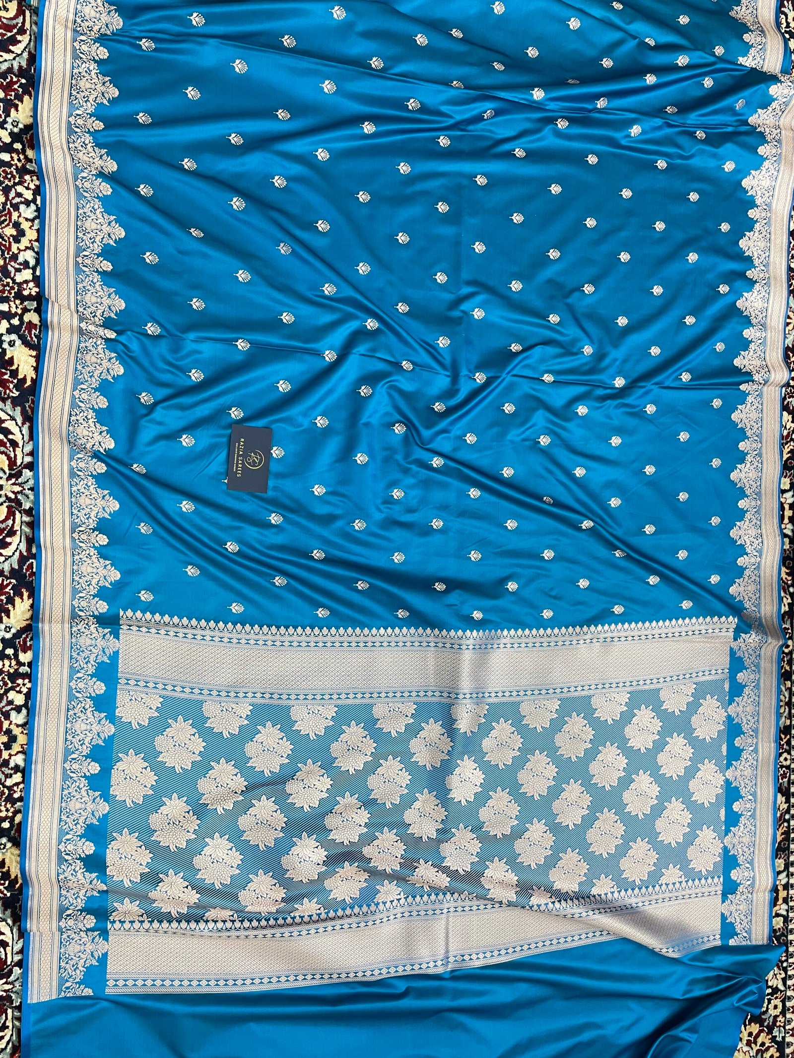 Delivered in 4 DaysThe Ivory Firozy Designer Booti Mashru Katan Silk Banarasi Saree showcases exquisite craftsmanship with rich banarasi zari on fine Katan silk. Its vibrant shade and elegant texture make it perfect for special occasions, combining traditional artistry with lasting quality and graceful drape.