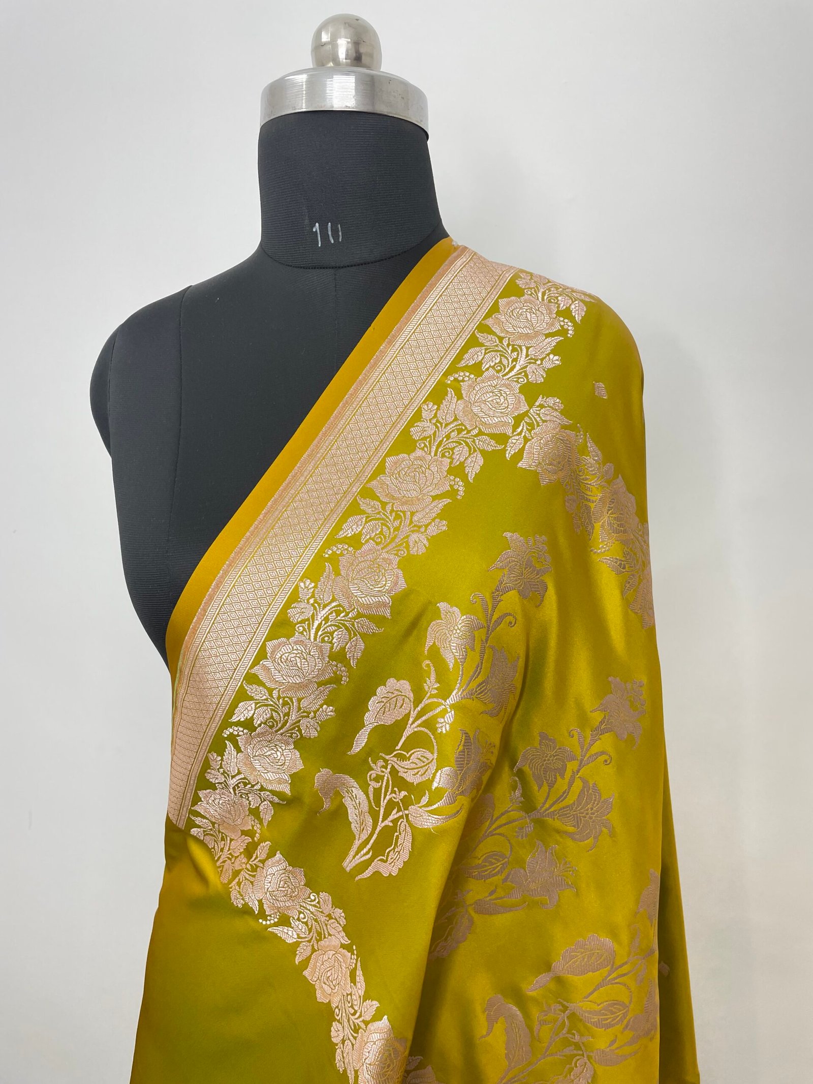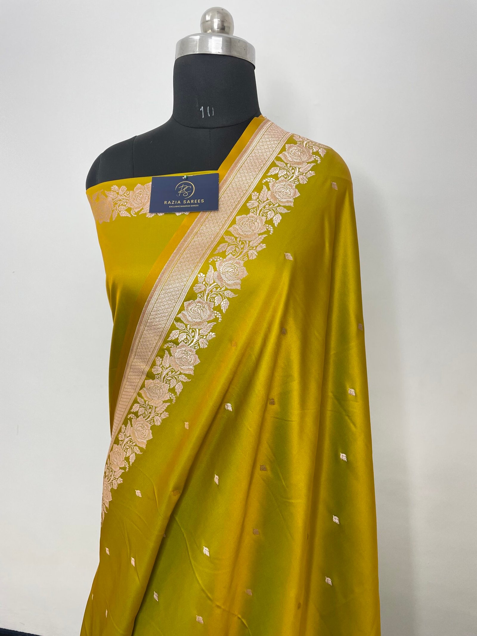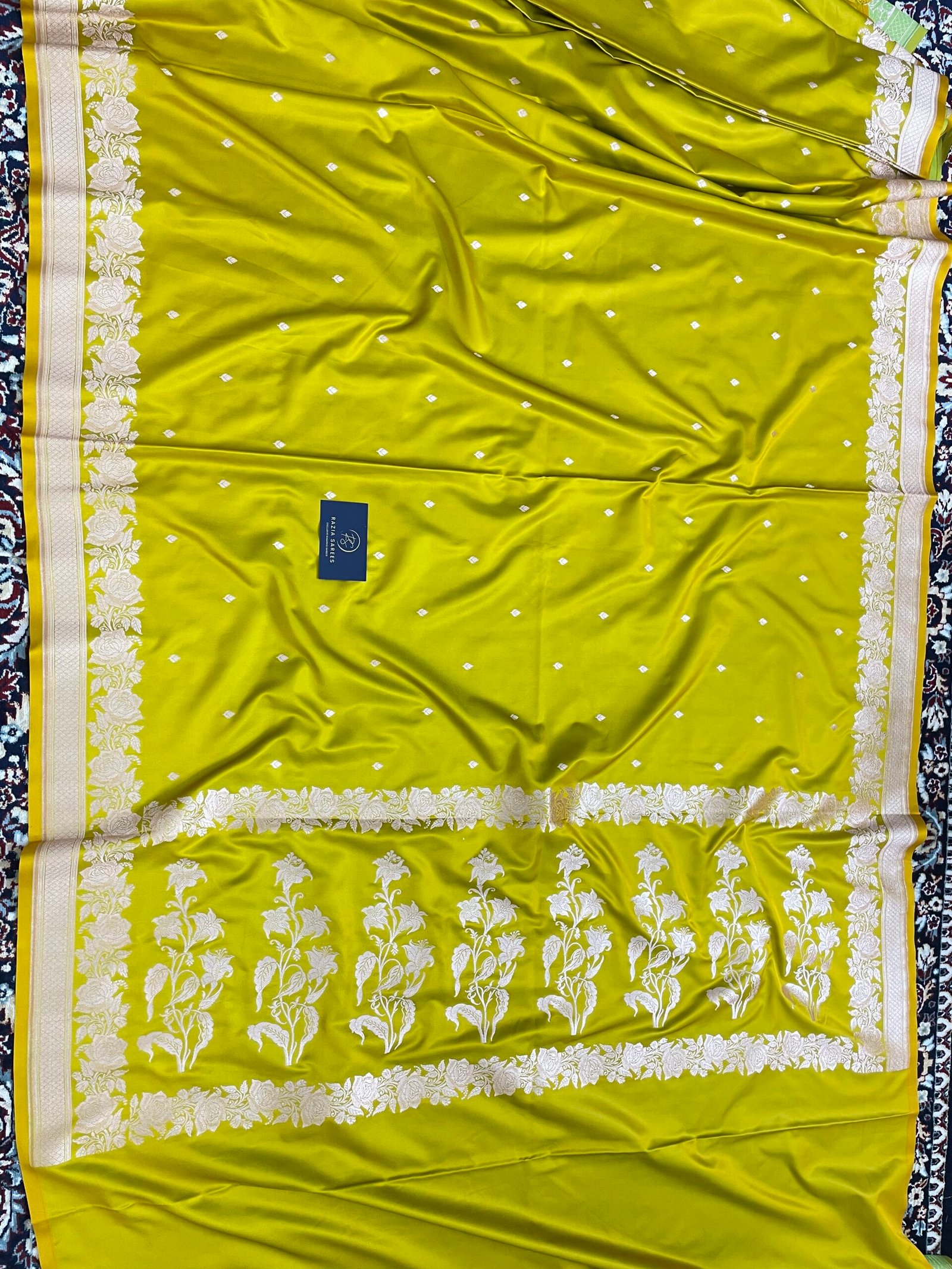 Ivory Green Designer Booti Mashru Katan Silk Saree
