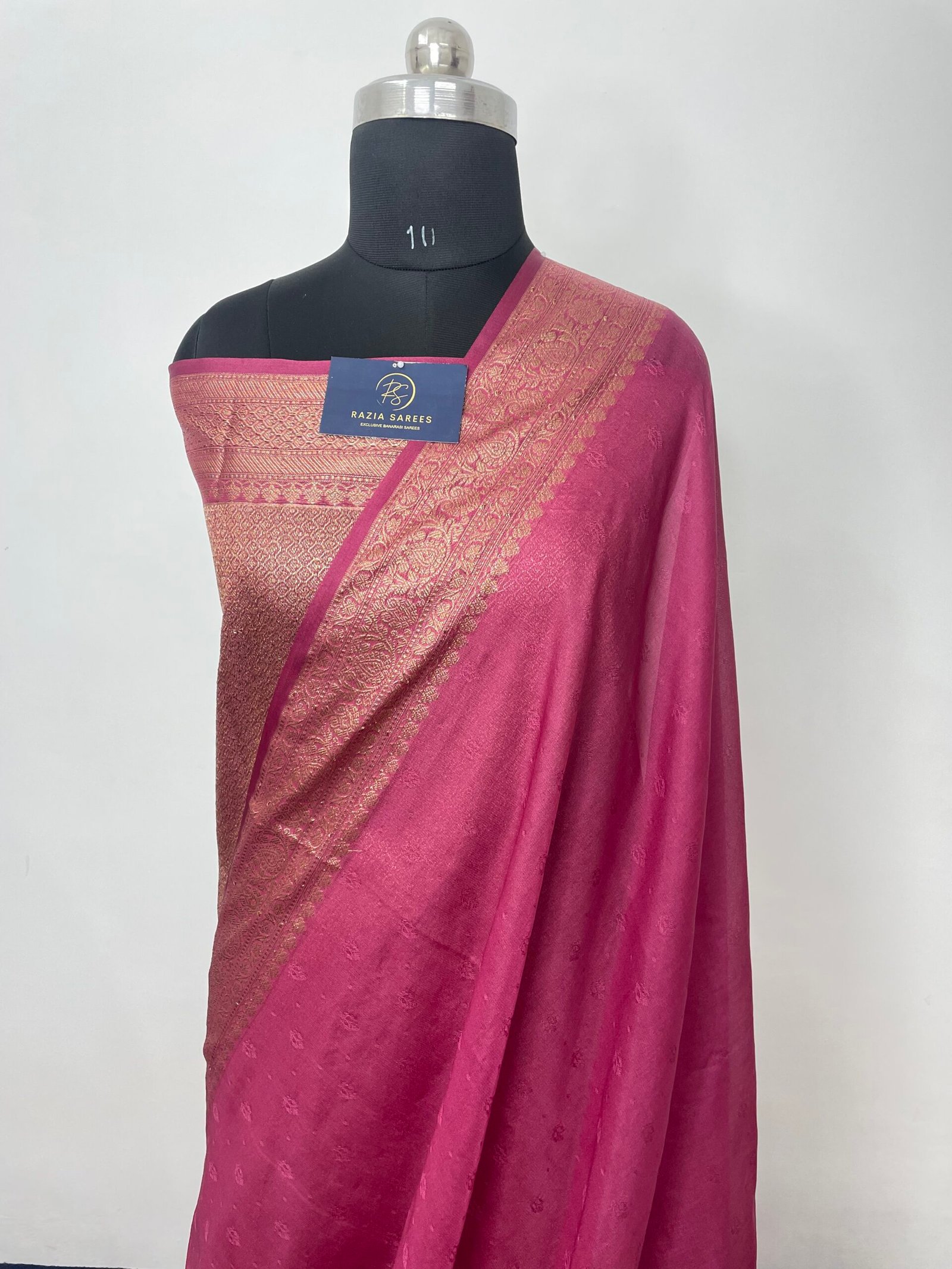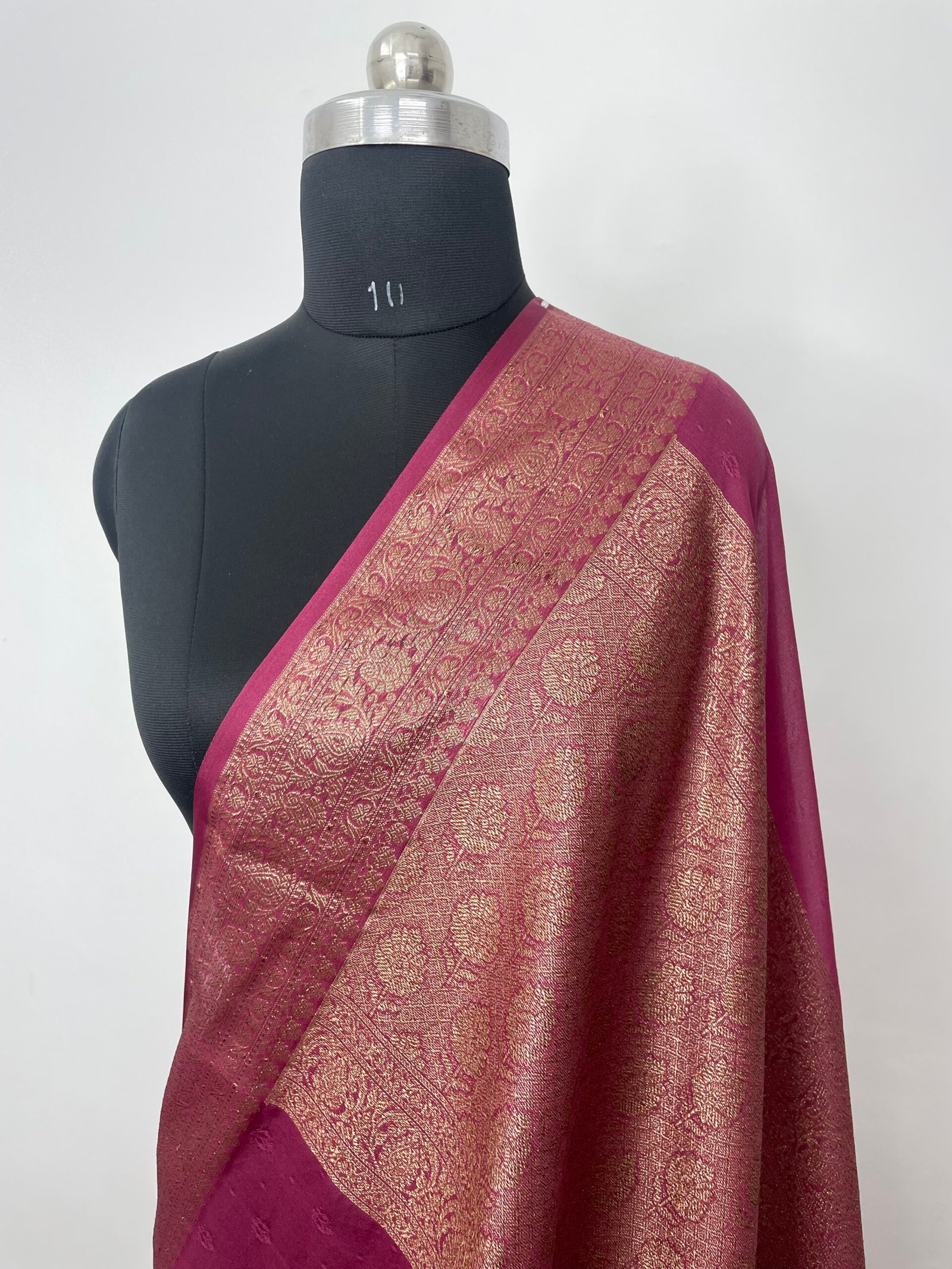 The Lovender Semi Khaddi Georgette Silk Banarasi saree is crafted from a luxurious blend of khaddi Georgette Silk, perfect for special occasions. The sophisticated fabric gives a glamorous look.