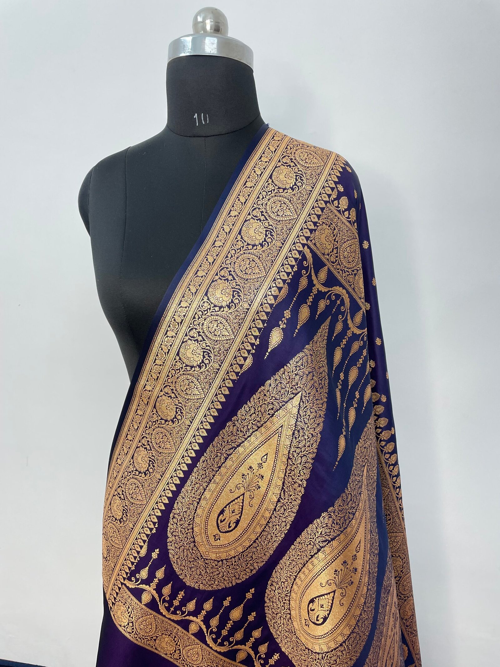 Delivered in 4 DaysThe Navy Blue Booti Satin Katan Silk Banarasi Saree showcases exquisite craftsmanship with rich banarasi zari on fine Katan silk. Its vibrant shade and elegant texture make it perfect for special occasions, combining traditional artistry with lasting quality and graceful drape.