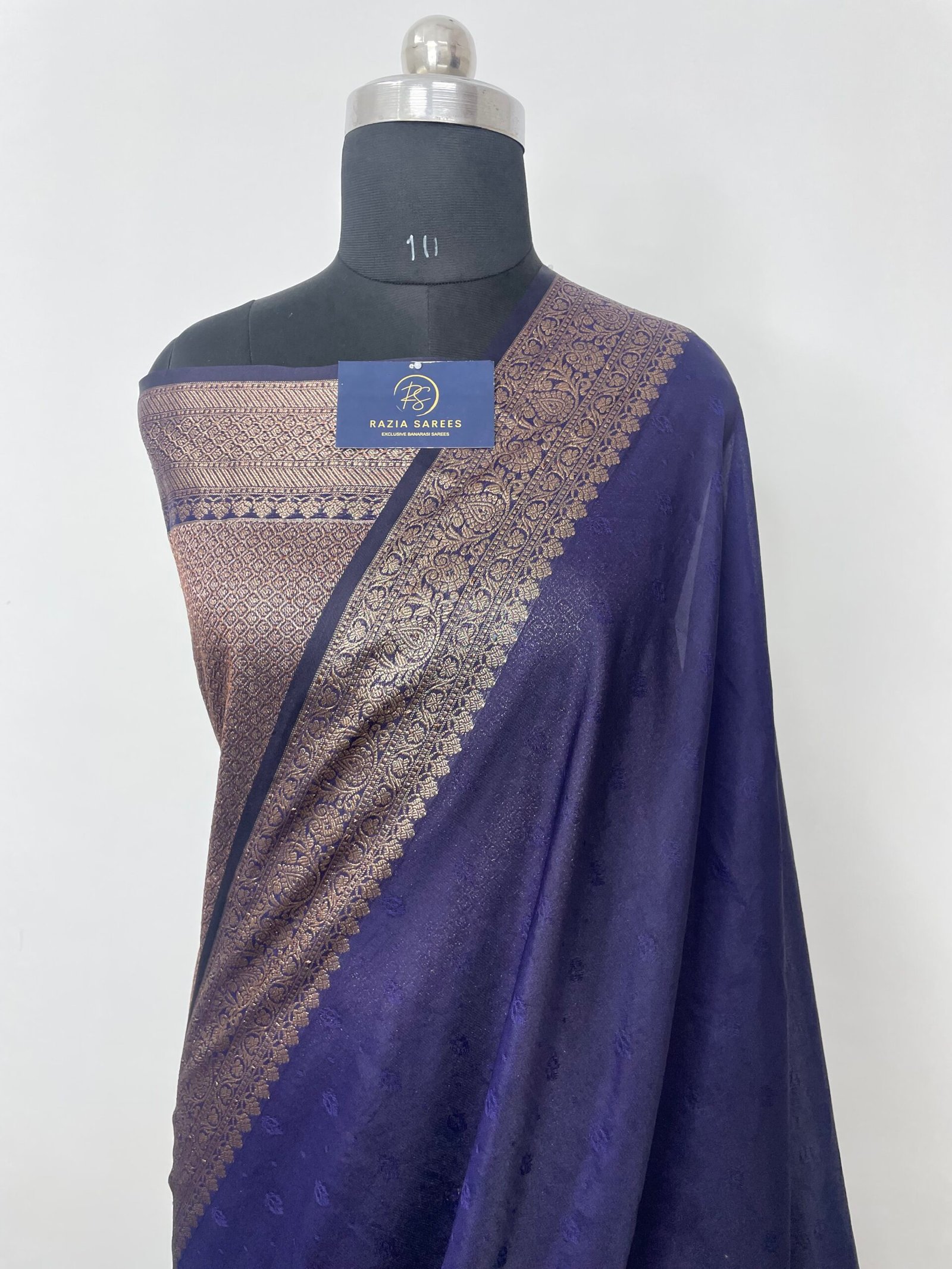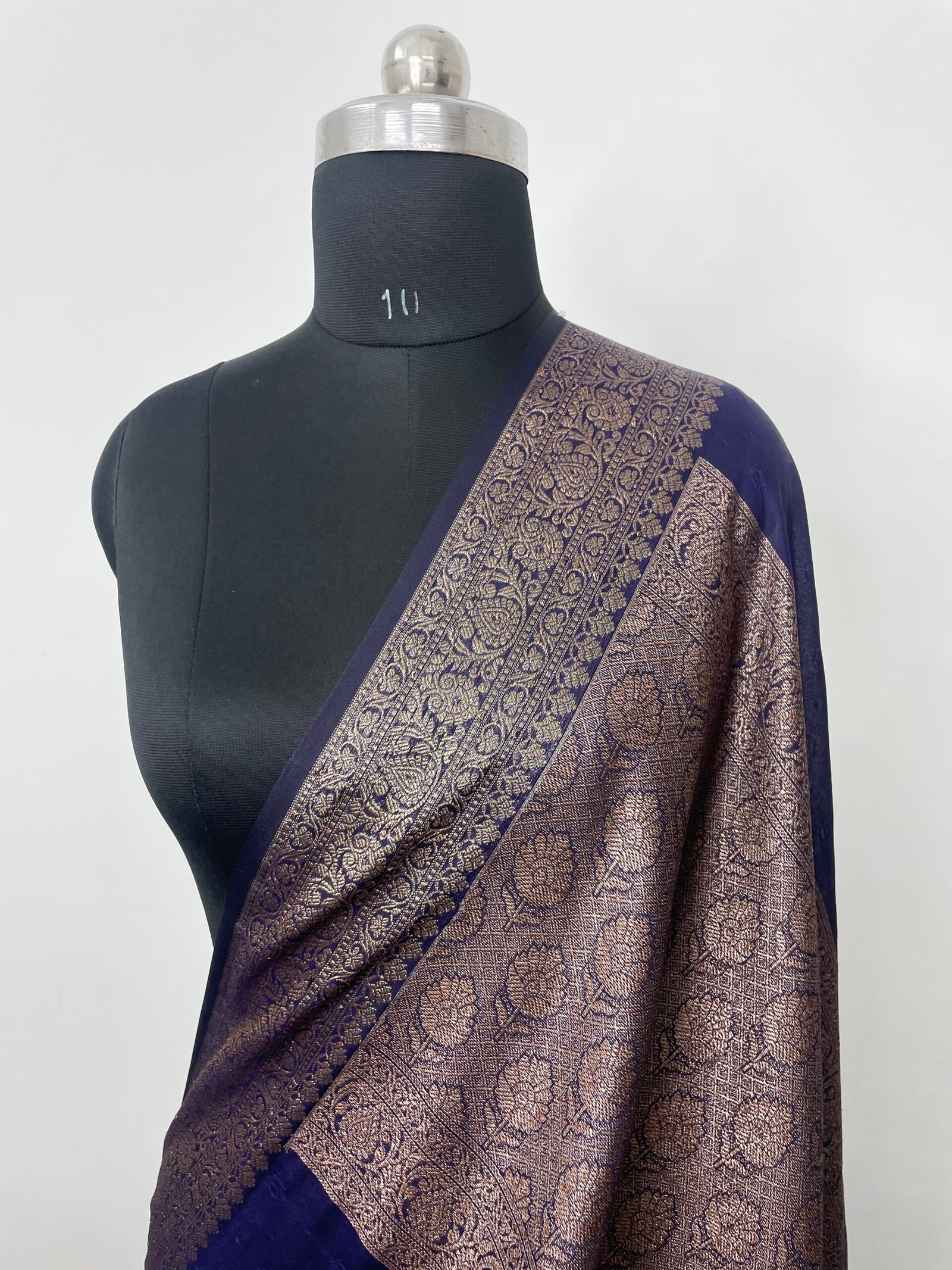 Delivered in 4 DaysThe Navy Blue Semi Khaddi Georgette Silk Banarasi saree is crafted from a luxurious blend of khaddi Georgette Silk, perfect for special occasions. The sophisticated fabric gives a glamorous look.