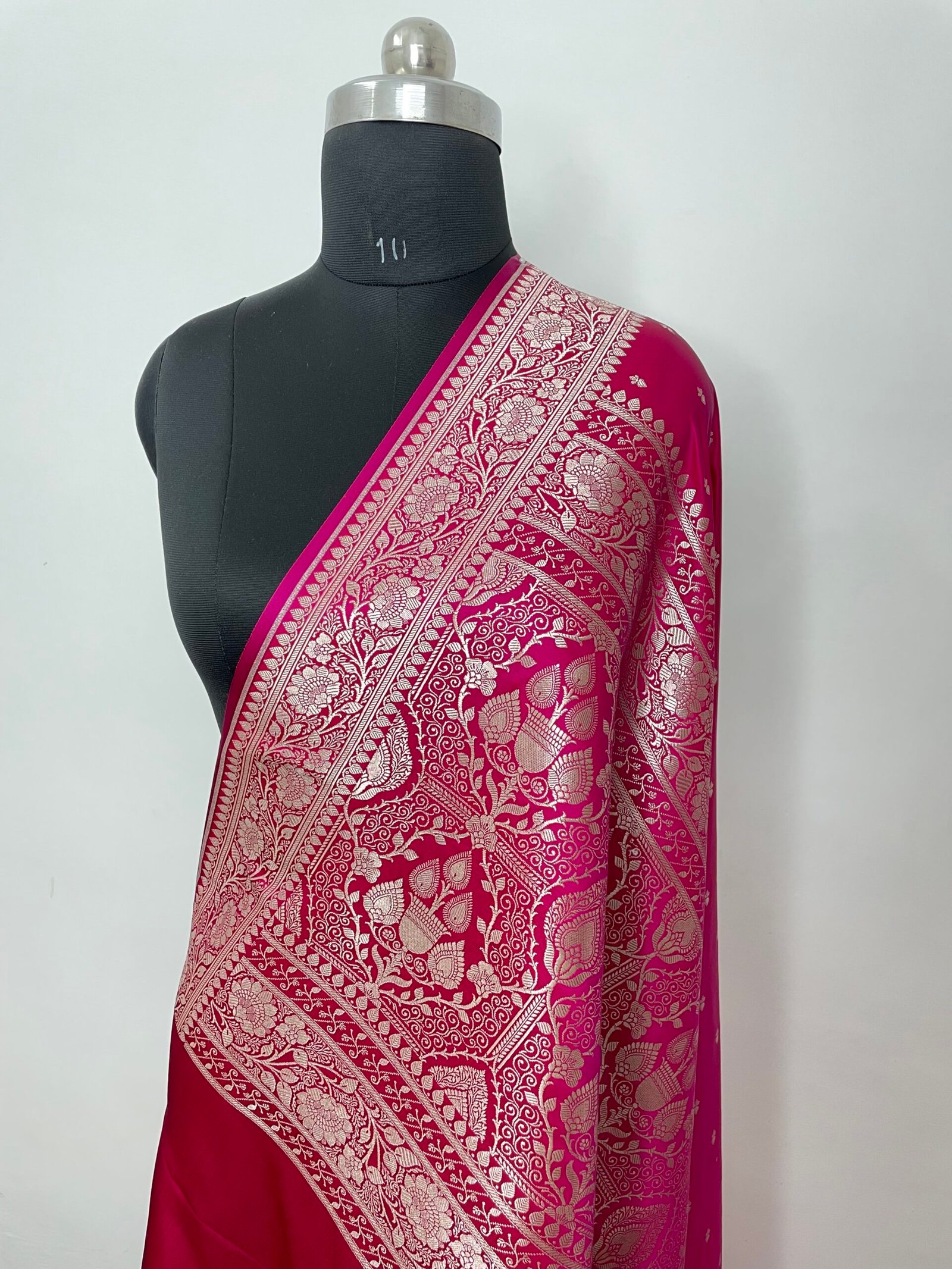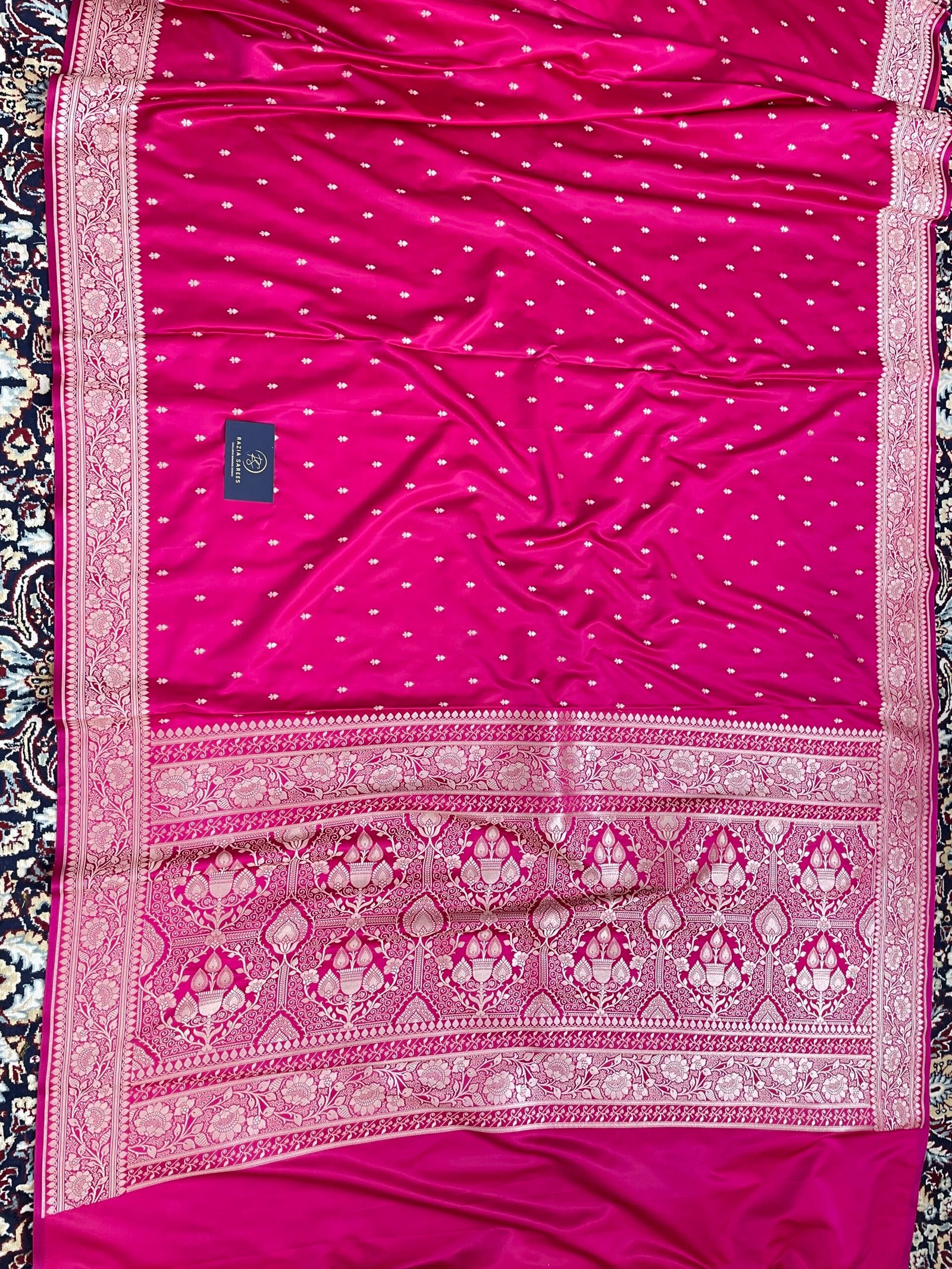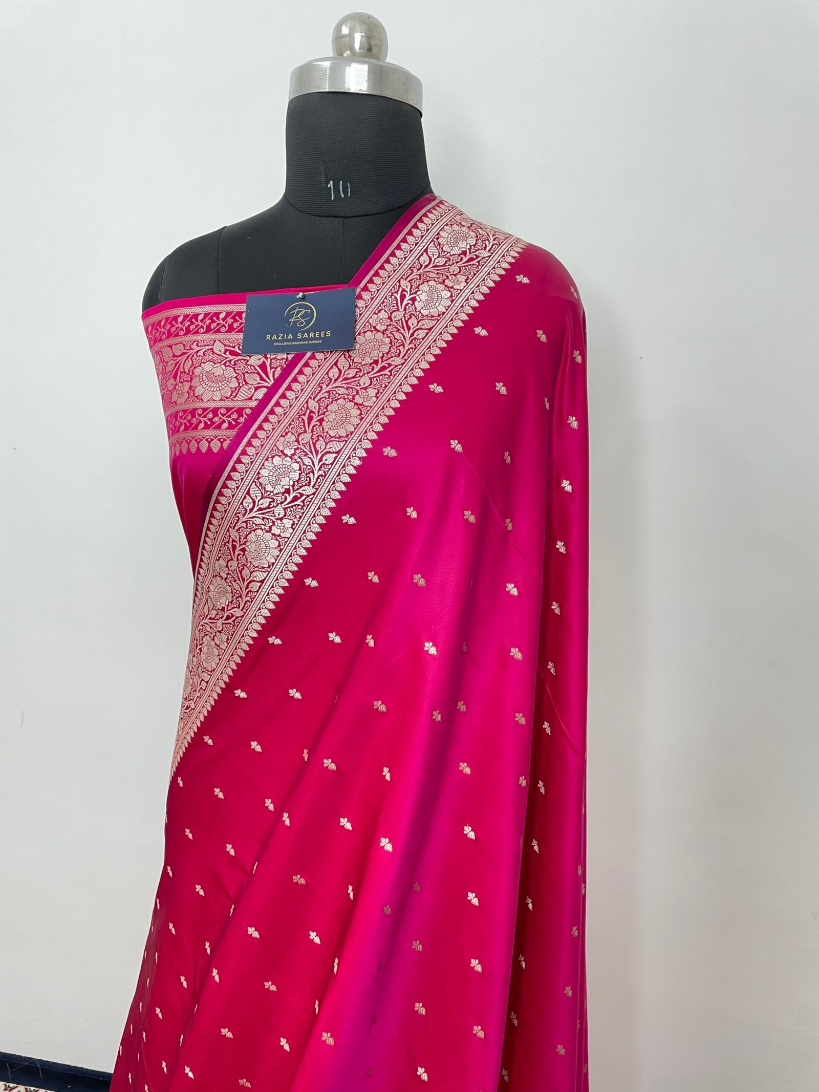 Delivered in 4 DaysThe Rani Pink Booti Mashru Katan Silk Banarasi Saree showcases exquisite craftsmanship with rich banarasi zari on fine Katan silk. Its vibrant shade and elegant texture make it perfect for special occasions, combining traditional artistry with lasting quality and graceful drape.