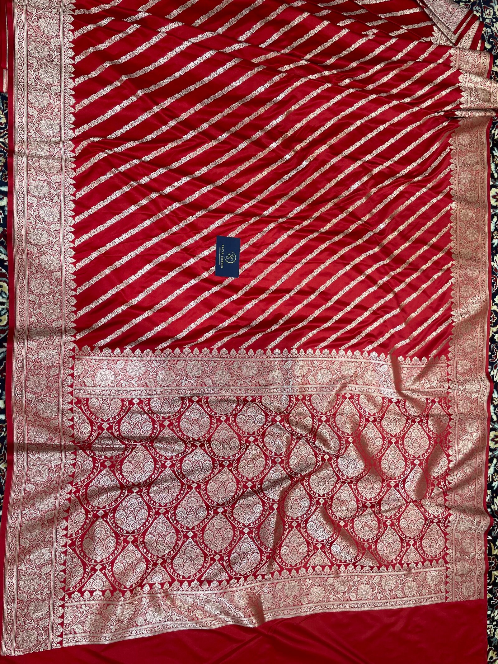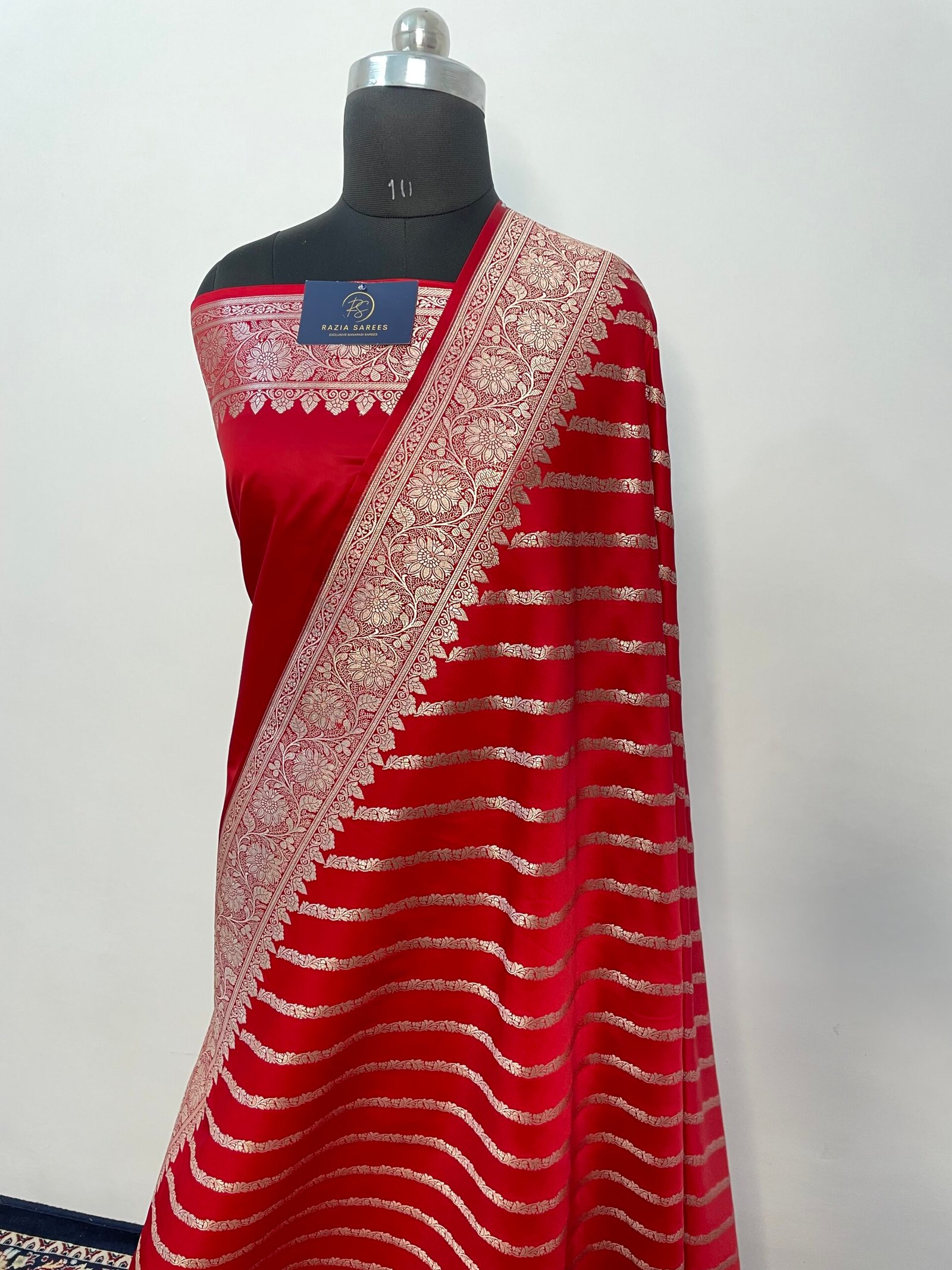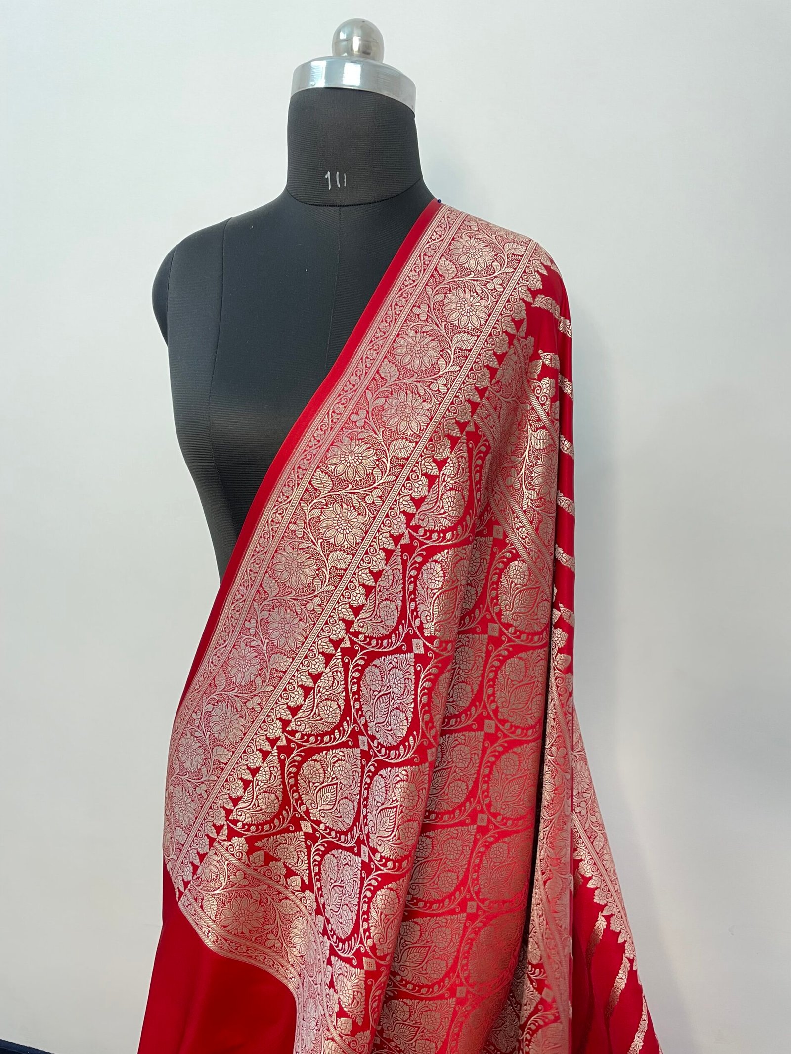 Delivered in 4 DaysThe Red Aada Mashru Katan Silk Banarasi Saree showcases exquisite craftsmanship with rich banarasi zari on fine Katan silk. Its vibrant shade and elegant texture make it perfect for special occasions, combining traditional artistry with lasting quality and graceful drape.