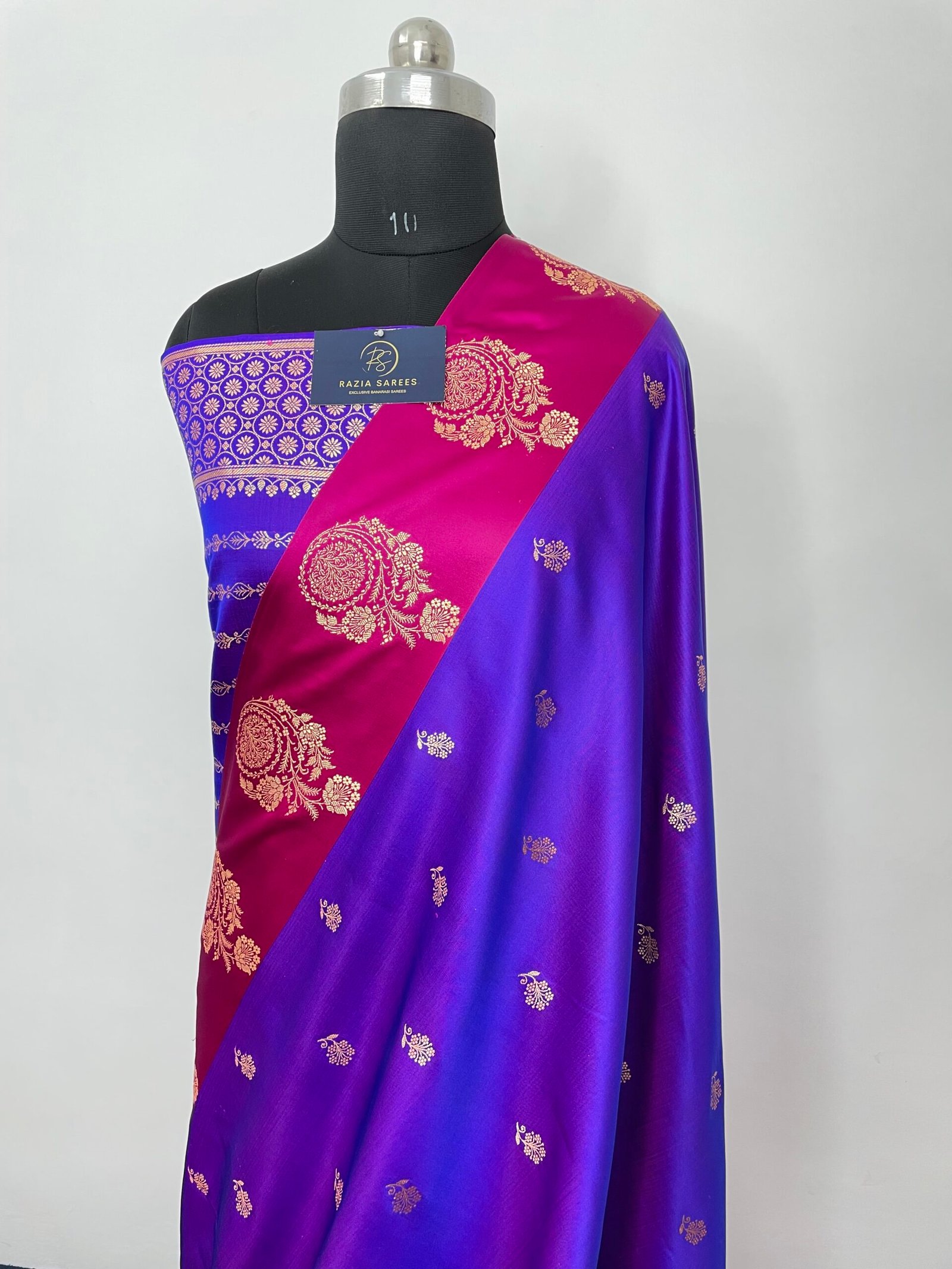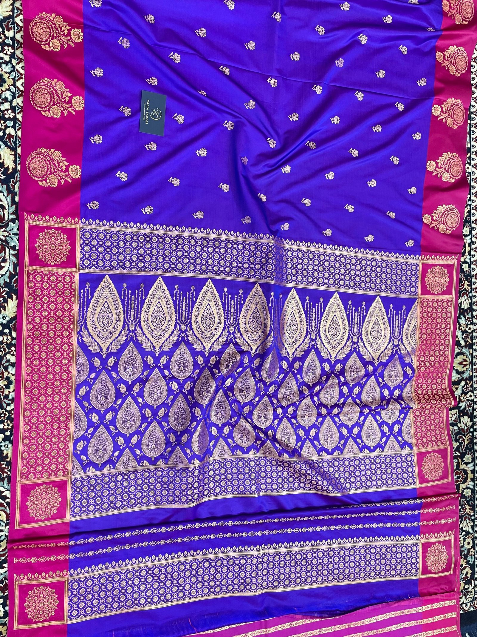 Royal Blue Rani Contrast Fancy Satan Patta Buti Satin Katan Silk Saree