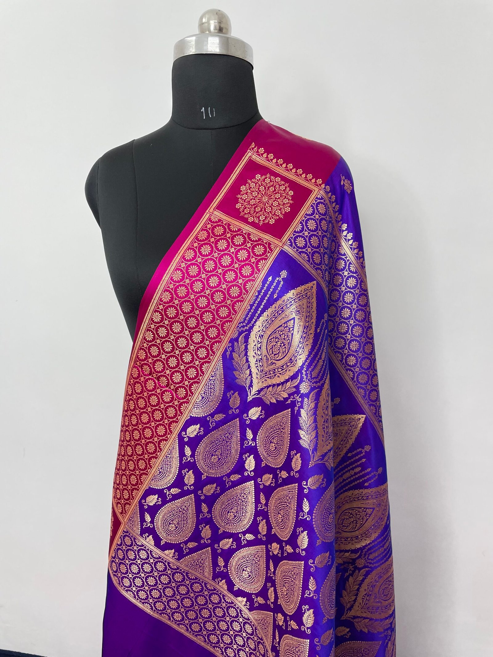 Delivered in 4 DaysThe Royal Blue Rani Contrast Fancy Satin Katan Silk Banarasi Saree showcases exquisite craftsmanship with rich banarasi zari on fine Katan silk. Its vibrant shade and elegant texture make it perfect for special occasions, combining traditional artistry with lasting quality and graceful drape.