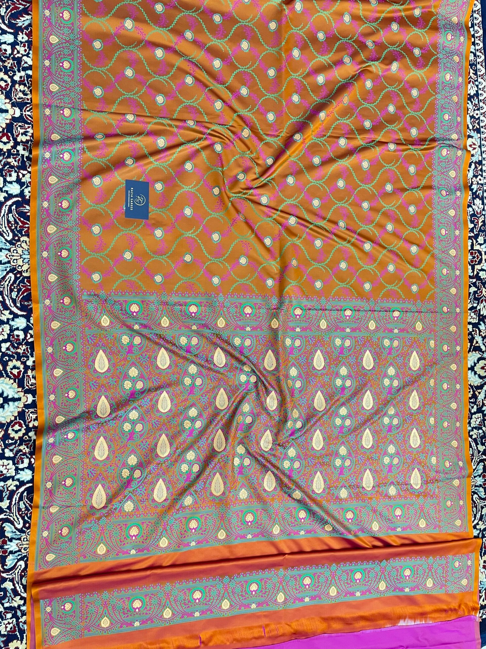 Delivered in 4 DaysThe Rust Tilfi Jamawar Mashru Katan Silk Banarasi Saree showcases exquisite craftsmanship with rich banarasi zari on fine Katan silk. Its vibrant shade and elegant texture make it perfect for special occasions, combining traditional artistry with lasting quality and graceful drape.